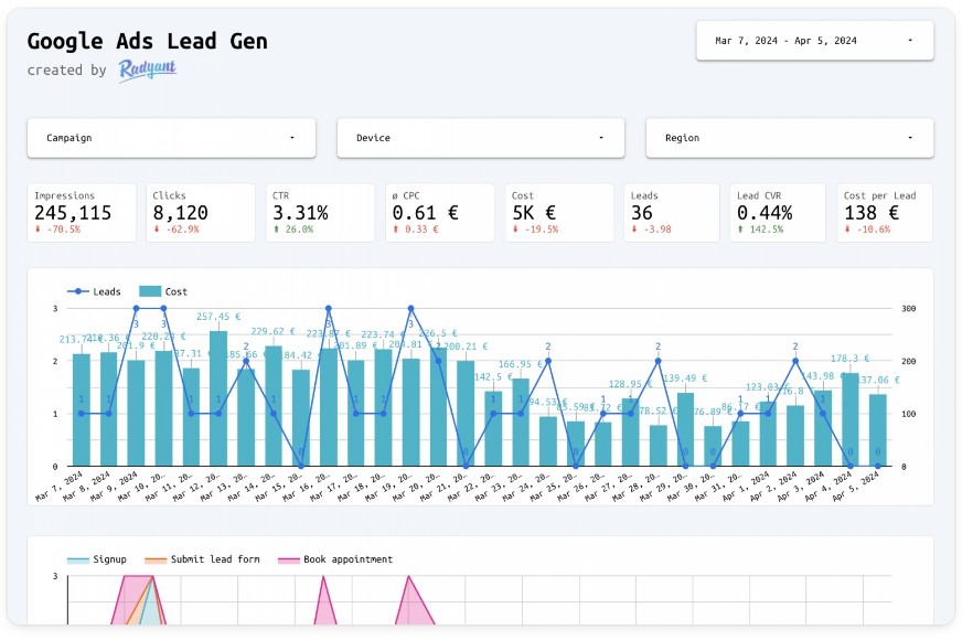 Data Bloo's Essential Google Ads template spans 20 pages and covers campaign type breakdowns, keyword performance, landing page analysis, location and audience data — and it's featured by Google in the official Looker Studio gallery. Radyant's Pro Dashboards Bundle, currently available at $149, adds cross-filtering between keywords and search queries, YoY insights, and day/time performance breakdowns that free versions don't include. For agencies sending weekly reports to clients, a paid Google Ads client reporting template with built-in commentary sections and rebrand placeholders removes hours of manual work per month.