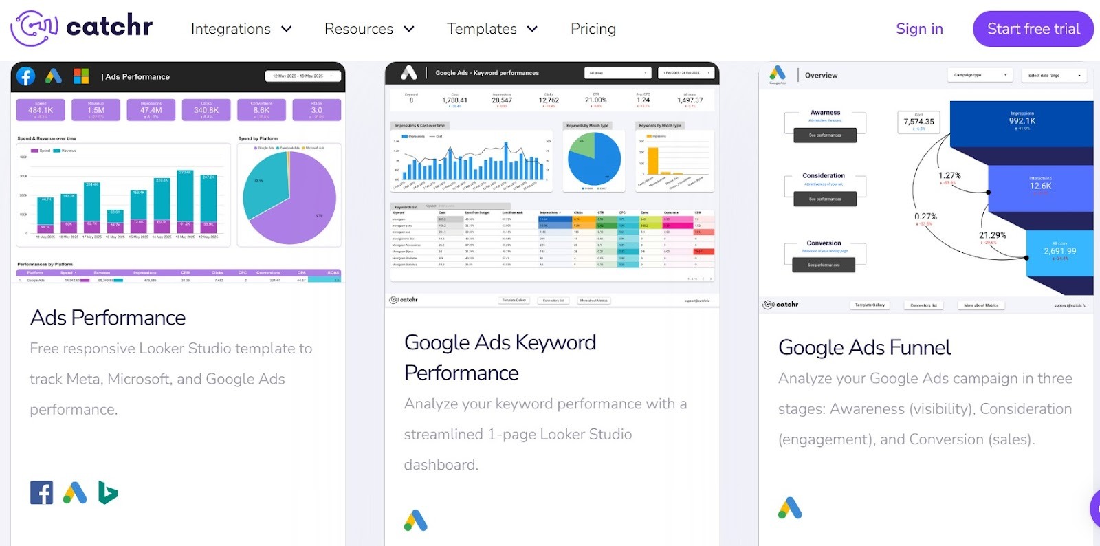 This matters most in three situations: when you report to clients regularly, when you manage multiple accounts, and when you need to compare performance across time periods or channels. Catchr.io, for example, organizes their Google Ads templates specifically around these use cases — SEA performance, lead generation, ecommerce, and PPC overview — because those are the reporting contexts where a static spreadsheet simply stops working.