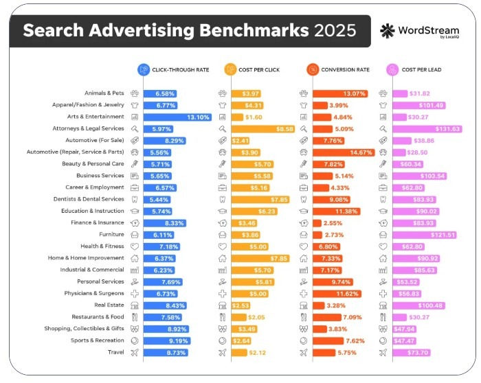 These three tell you whether your money is working. According to the same WordStream/LocaliQ 2025 data, average CPC across all industries is $5.26 — up 12.88% year over year, with 87% of industries seeing increases. Kelsie Mixon, Customer Success Manager at LocaliQ, puts it directly: "It's important that we're constantly checking on the campaigns to make sure our bids are appropriate for each keyword. If our CPC is too high, we won't be able to prove a valuable return on investment."