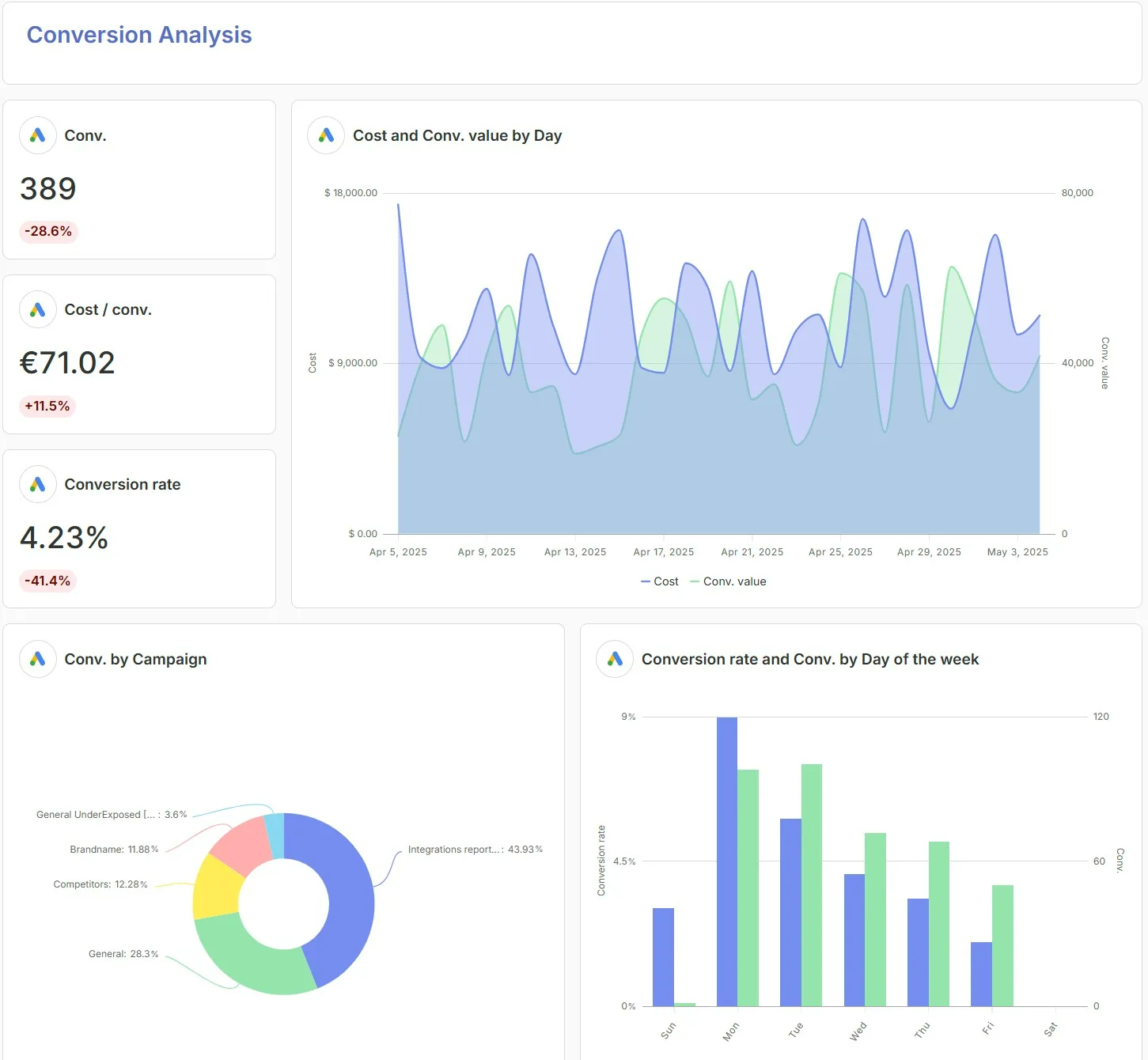 The native Google Ads interface is built for managing campaigns, not for reporting. You can pull numbers, but assembling a coherent picture across campaigns, periods, and accounts takes real effort — especially when you need to share it with someone outside the platform.