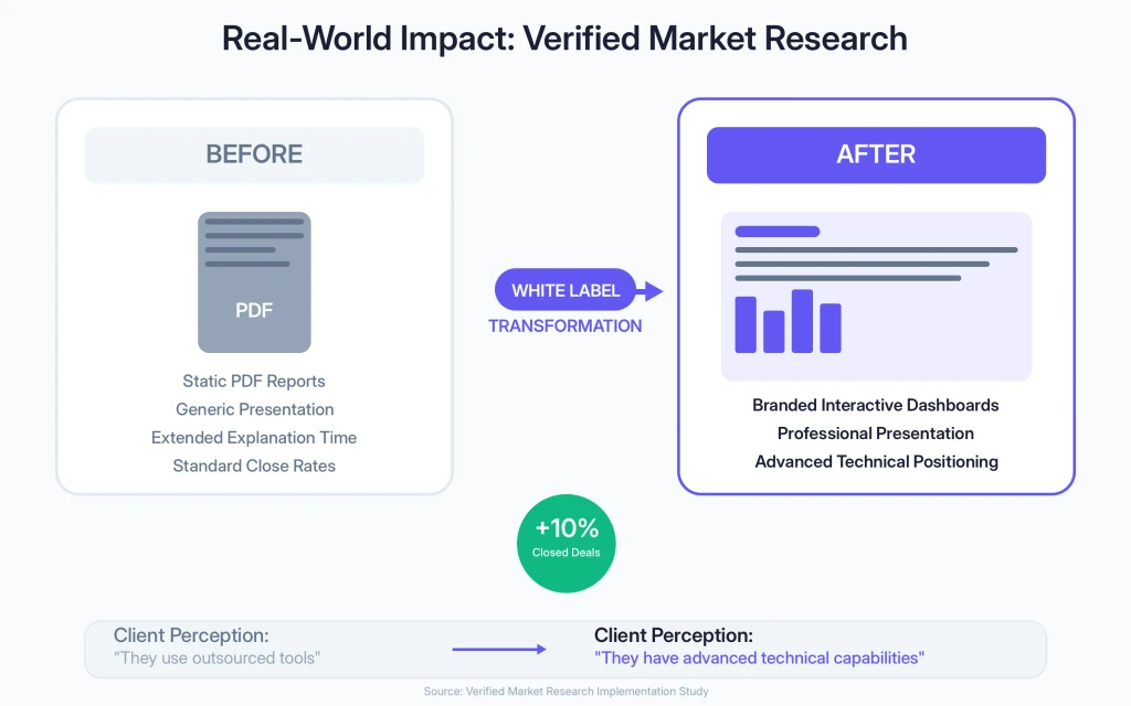 The business case is clear: according to Wayfront's 2025 white-label reporting analysis, agencies that switch to branded, transparent dashboards see client churn drop by up to 50%. Verified Market Research, a consulting company cited in the same report, transitioned from static PDFs to branded interactive dashboards and saw a 10% increase in closed deals within months — while cutting the time spent explaining reports in half.