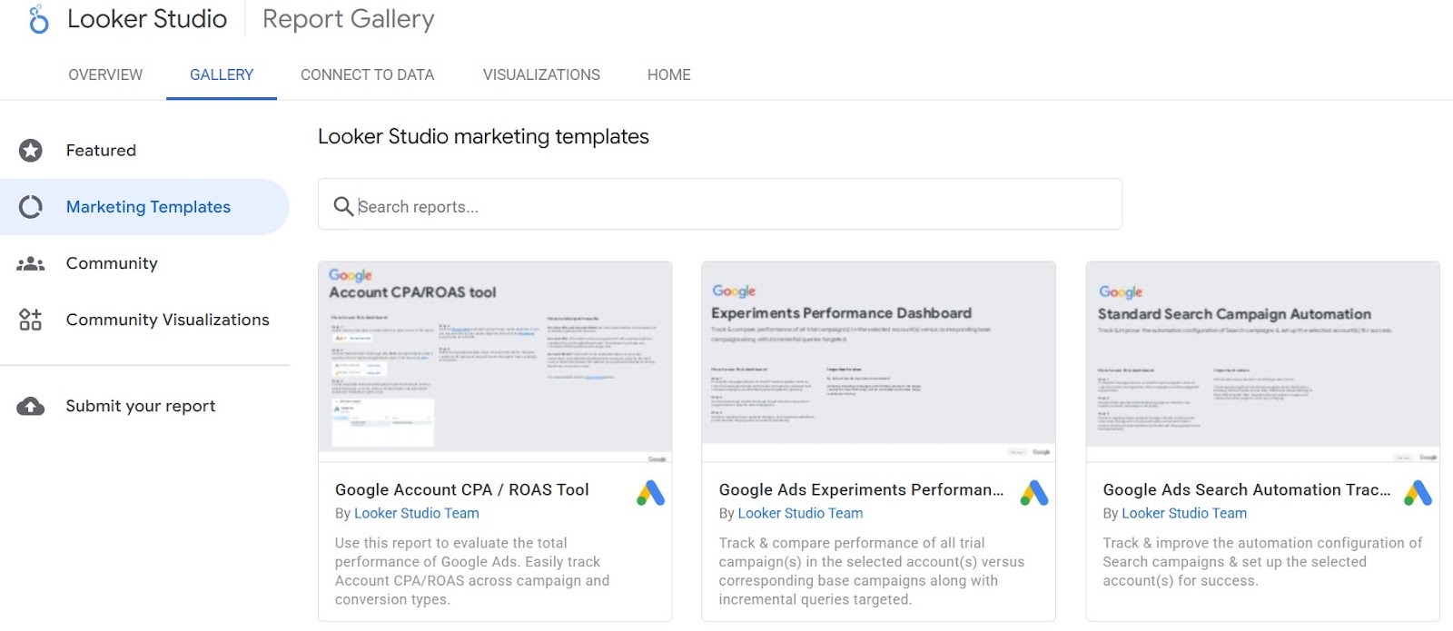A Google Ads Looker Studio template is a pre-built dashboard that connects directly to your Google Ads account and visualizes campaign performance data automatically. Instead of building charts and metrics from scratch, you copy a template, connect your data source, and get a working report in minutes. Templates typically include impressions, clicks, CTR, CPC, conversions, and ROAS, organized across one or more pages with filters and date controls already in place. Searching for a Google Ads report template, Looker Studio is the fastest way to find a working structure without building from scratch.
