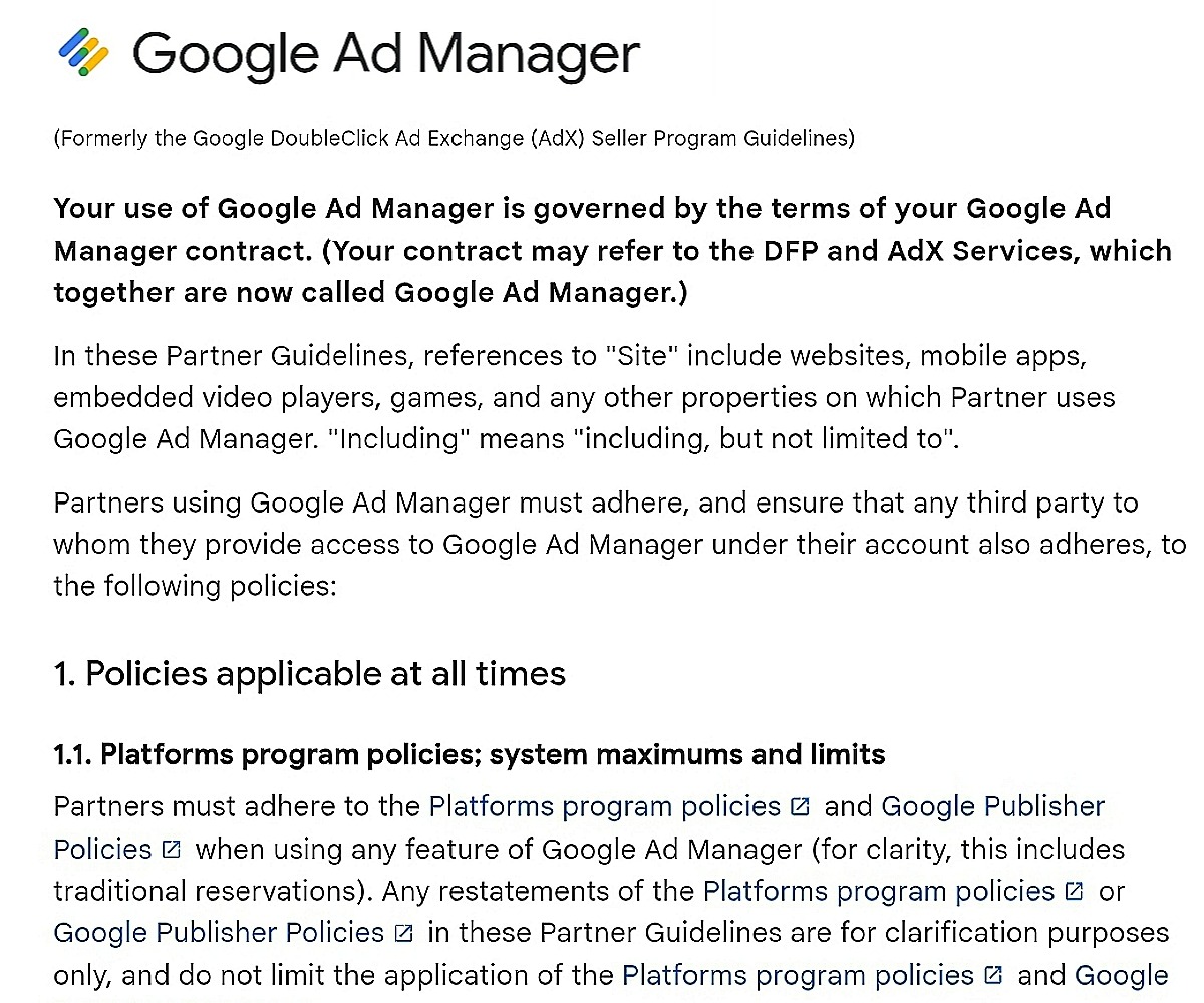 Using Google Ad Manager comes with a set of rules and regulations to which both the ads manager and every ads account under them must adhere. These policies cover every other regulation that applies to regular Google Ads accounts, with the inclusion of Multiple Customer Management (MCM) and Scaled Partner Management (SPM) policies.