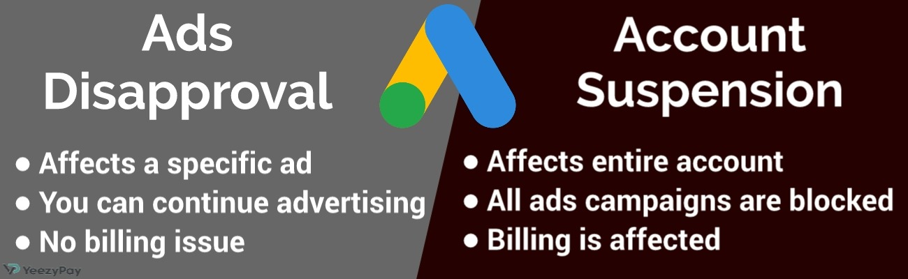 It is important to clarify the distinction between ads disapproval and Google Ads account suspended. In simple terms, disapprovals are like warnings, while suspension is like a“full stop”.