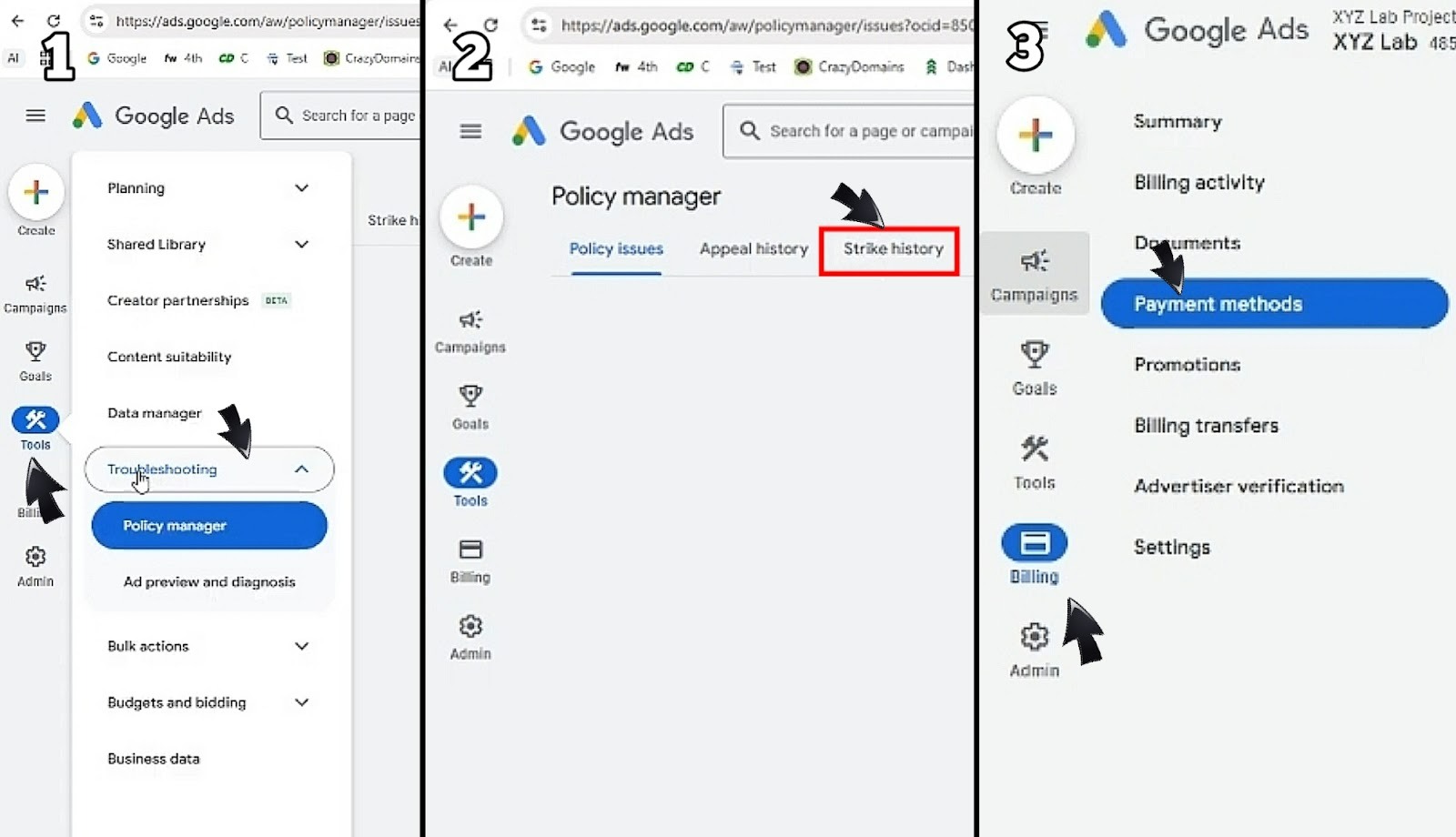 To access Policy Manager in the new Google Ads interface, go to “Tools & Settings”, and then click on “Troubleshoot”. You will then be able to see all the campaigns, ad groups, or assets, and identify the one that is flagged. To see when the violation happened, click on “Strike history” on the top pane and you can view the series of activities that built up to the suspension of your account,