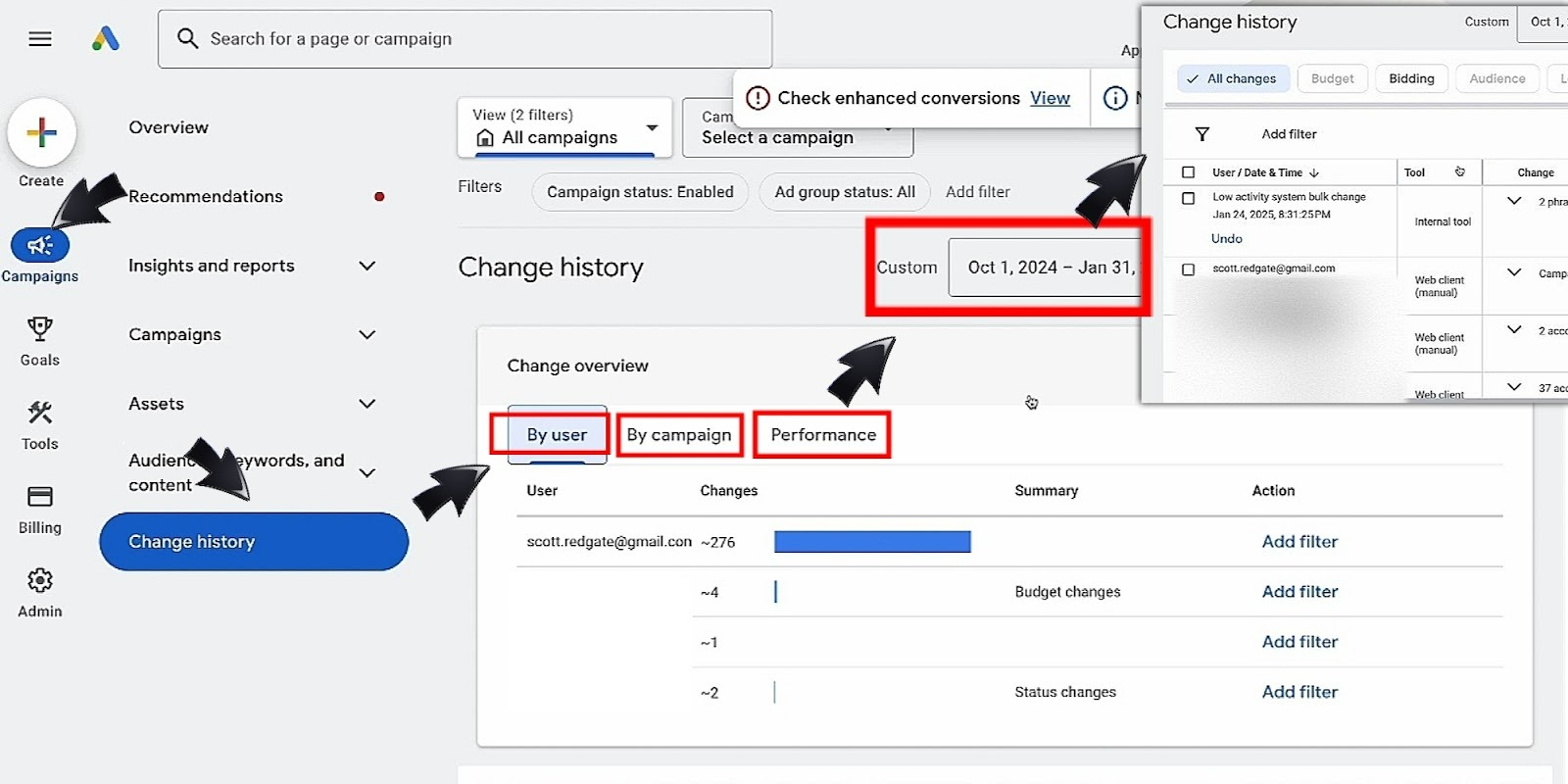 To get a list of the modifications that were made in your account before suspension, you will need to visit the “Change history” tab under “Campaigns”. The change log can be filtered in four ways: