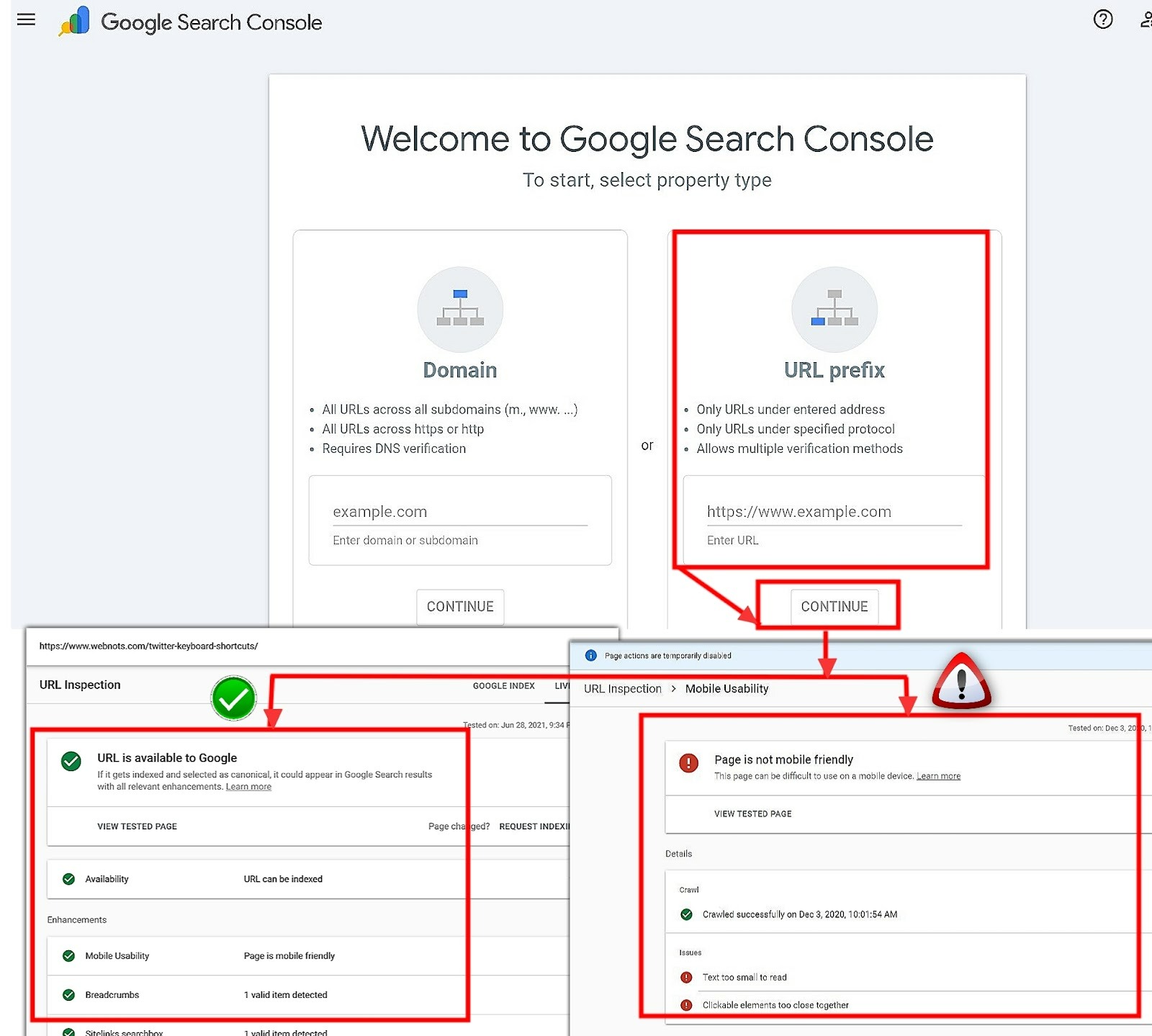 To use “Fetch as Google” in the most recent Google Webmaster interface, search for “Google Search Console” and click on “URL Prefix”. Enter your web address and then click “Continue”. You will be able to navigate through the URL Inspection to see the current status of your landing page according to Google.