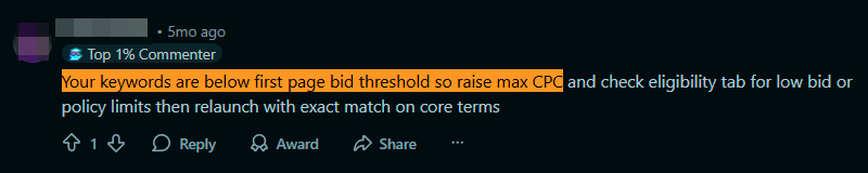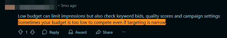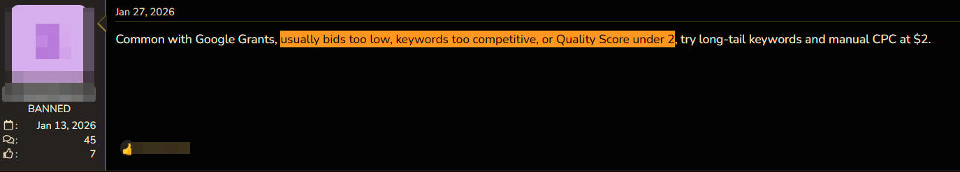 The system can also go into overdrive due to technical issues with the keywords themselves. Experienced affiliates are accustomed to checking the Quality Score for each individual keyword. If this score falls below 2, impressions can be completely cut even without official notice. Here's what affiliates have written about this on BHW and Reddit: