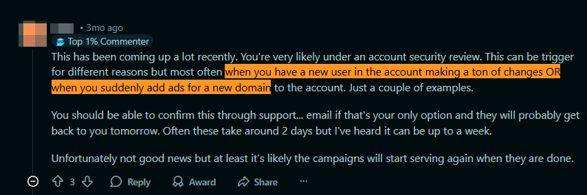 Another typical trigger is linking a new domain. The algorithm instantly stops spending for a deep check. At this point, the forecasting tool breaks, new campaigns stop entering the auction, and support channels simply vanish, leaving only email as a contact option.
