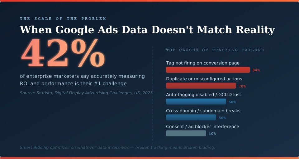 This isn't a rare problem. According to Statista's research on digital display advertising challenges in the US, 42% of enterprise marketers named accurately measuring ROI and performance metrics as their primary pain point — and unreliable conversion data sits at the root of that problem. The issue shows up across account sizes — from a local service business getting zero recorded leads to an e-commerce brand suddenly seeing purchase conversions drop to zero after a checkout redesign.