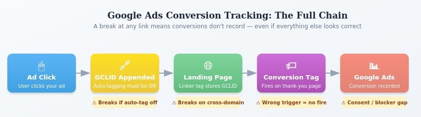 Before debugging anything, it helps to understand what the system is actually doing. Google Ads conversion tracking is not a single piece of code — it's a chain of components that have to work together correctly. A break anywhere in that chain means Google Ads conversions are not tracking, even if every individual piece looks fine in isolation.