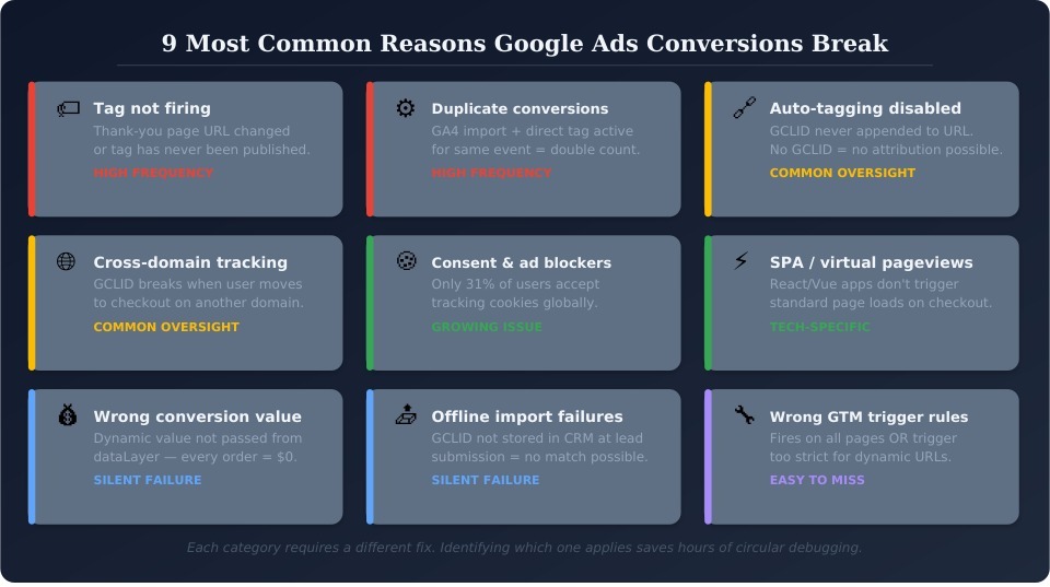 Most Google Ads conversion tracking issues fall into one of several recurring categories. Understanding which category applies to your situation narrows down the fix considerably.