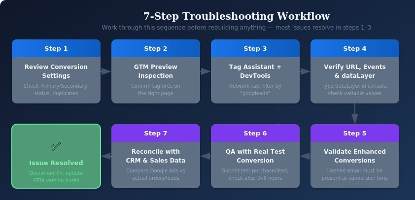 When Google Ads conversion tracking is not working, the temptation is to jump straight to GTM or tag settings. That's usually a mistake. Most problems follow a pattern, and working through them in a defined order saves time and prevents the circular debugging that eats up hours. The workflow below moves from the simplest checks to the most technical ones — so you're not reconfiguring your data layer when the actual issue is a wrong date range filter.