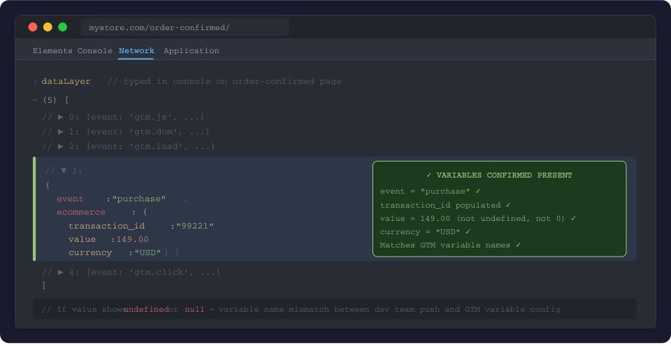 For event-based tracking, open the dataLayer in DevTools console and type dataLayer to inspect what's actually being pushed on the conversion page. Confirm that the event name matches what your GTM trigger is listening for (e.g., purchase vs. transaction vs. order_complete — these are not interchangeable). Dynamic conversion values — order total, currency, transaction ID — need to be present in the dataLayer at the moment the tag fires. If those variables return undefined, the tag fires but passes empty or zero values, which causes dynamic conversion values not passing to Google Ads — a silent failure that only shows up when you compare Google Ads revenue data against your actual backend numbers.