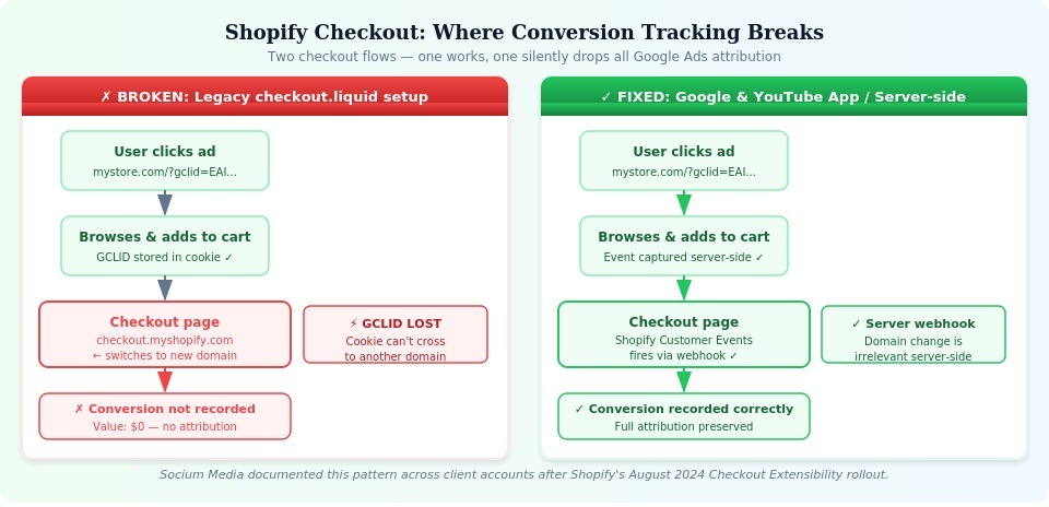 One additional Shopify-specific trap: the checkout subdomain. Shopify stores frequently complete transactions on checkout.myshopify.com rather than the merchant's primary domain. If your conversion tag fires on the confirmation page, but the GCLID was stored on your main domain and not passed through to the checkout subdomain, the attribution chain breaks. Cross-domain tracking between the storefront and the Shopify-hosted checkout must be explicitly configured, either via auto-linker in GA4 or through the Google & YouTube app.