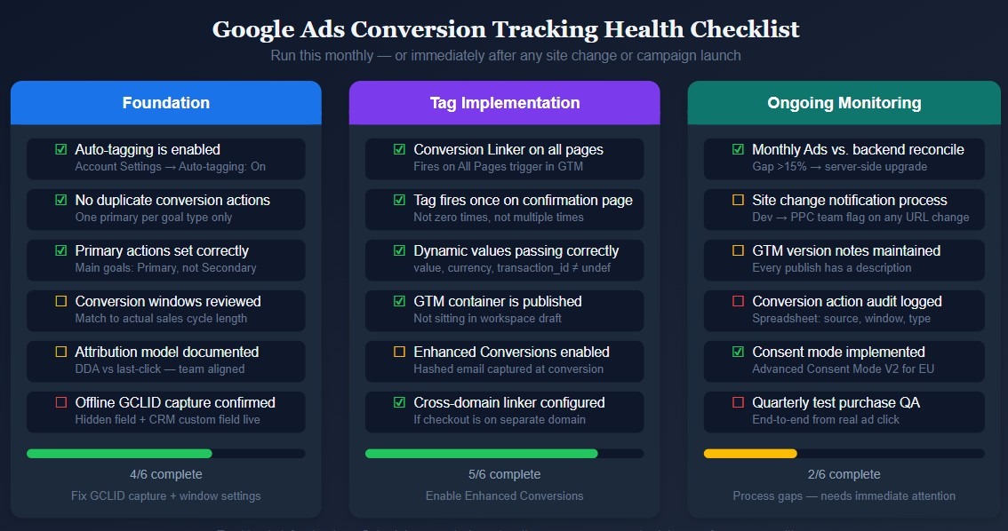 Every new campaign or site launch should go through a structured pre-flight check before spend goes live. The most common failure pattern — Google Ads tracking not working after website redesign — doesn't happen because developers are careless. It happens because there was no formal handoff between the team that built the site and the team running paid media.