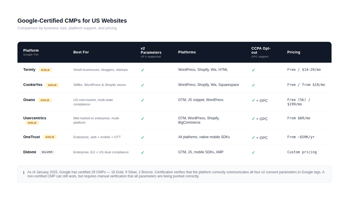 As of January 2025, there are 29 Google-certified CMPs — 18 with Gold tier, 9 with Silver, and 2 with Bronze. Google evaluates and certifies these partners against objective criteria including customer support and ease of technical integration, classified into those three tiers. The certification means the platform has been verified to correctly communicate all four v2 consent parameters to Google's tags — which is the part that tends to break in DIY implementations.