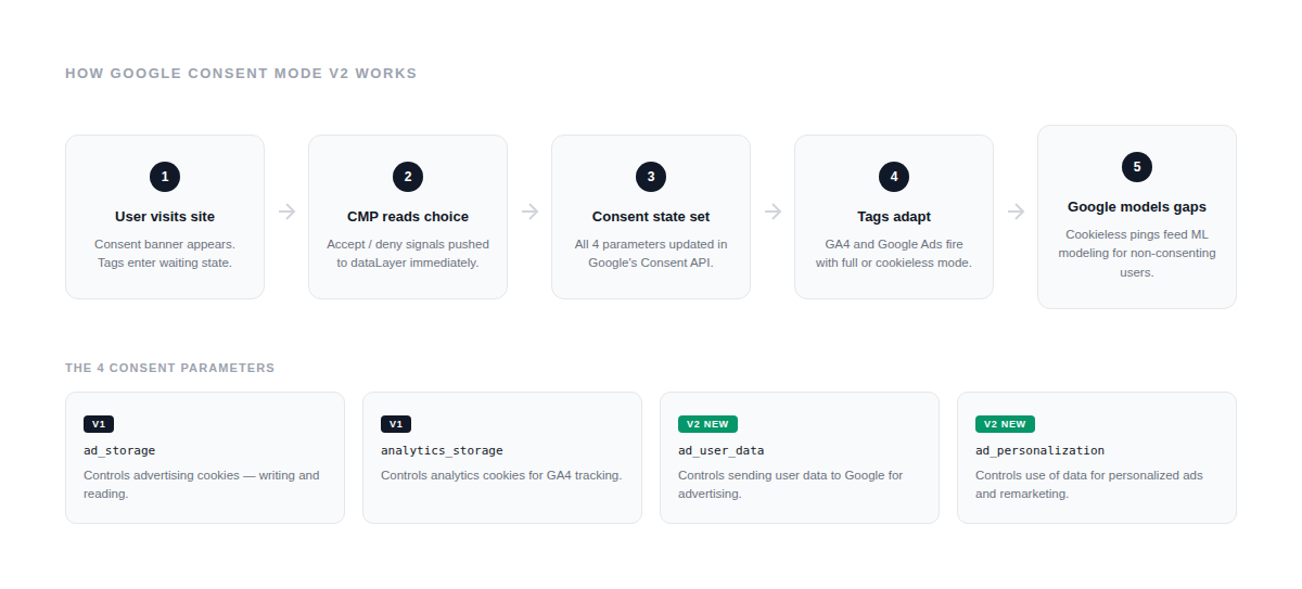 Google Consent Mode v2 is a signaling framework that tells Google's tags — GA4, Google Ads, Floodlight — how to behave depending on what a user has consented to. It works through four parameters: ad_storage and analytics_storage (which control cookie access for advertising and analytics), and ad_user_data and ad_personalization (new in v2, which control whether user data can be sent to Google for ads and whether it can be used for personalization). When a user denies consent, tags switch to cookieless mode — sending minimal pings without setting or reading any cookies. Google uses those cookieless pings to model conversions and fill measurement gaps through machine learning. The mechanism only works correctly when your consent management platform is properly wired to Google's Consent API and the consent defaults are set before your GTM snippet or gtag.js loads.