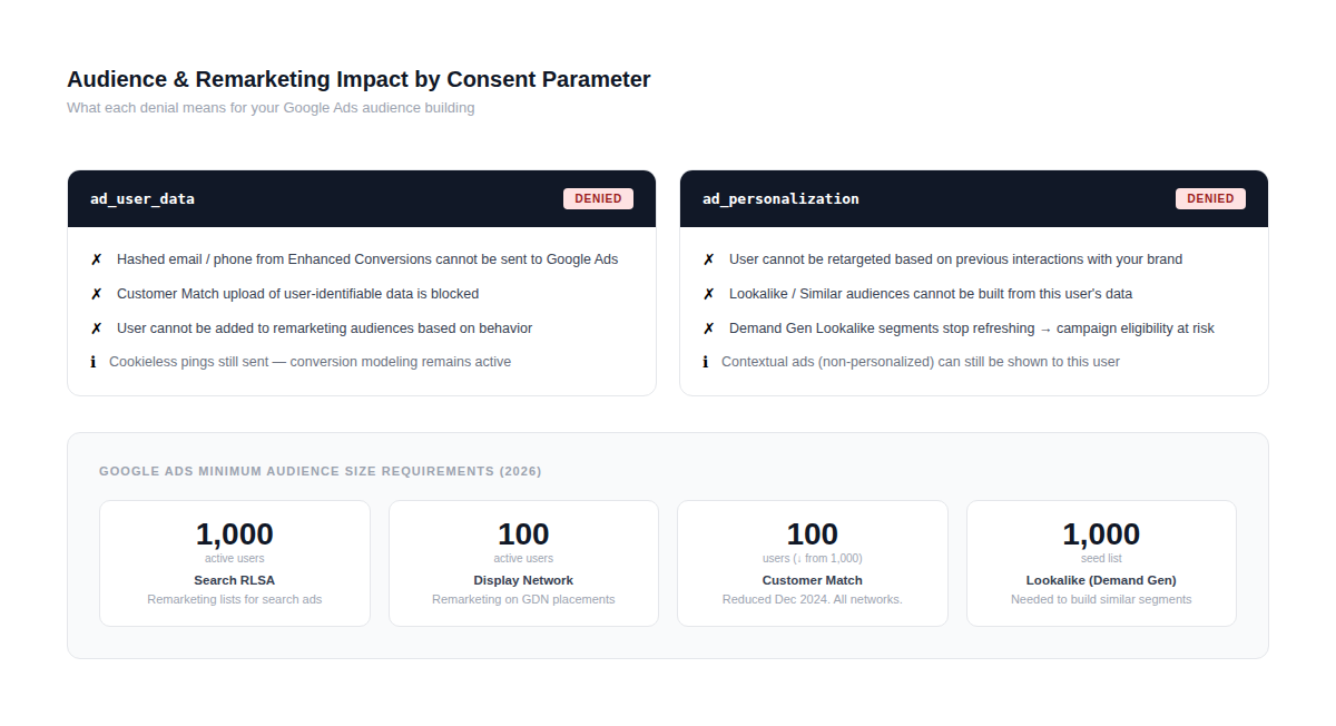Current minimum audience thresholds in Google Ads as of 2026: Search Network RLSA requires 1,000 active users; Display Network requires 100 active users; Customer Match now requires only 100 users across all networks, reduced from 1,000 in December 2024; Lookalike segments in Demand Gen campaigns need a 1,000-user seed list. These thresholds become relevant quickly if your consent rate is low and your audience lists stop refreshing with new users.