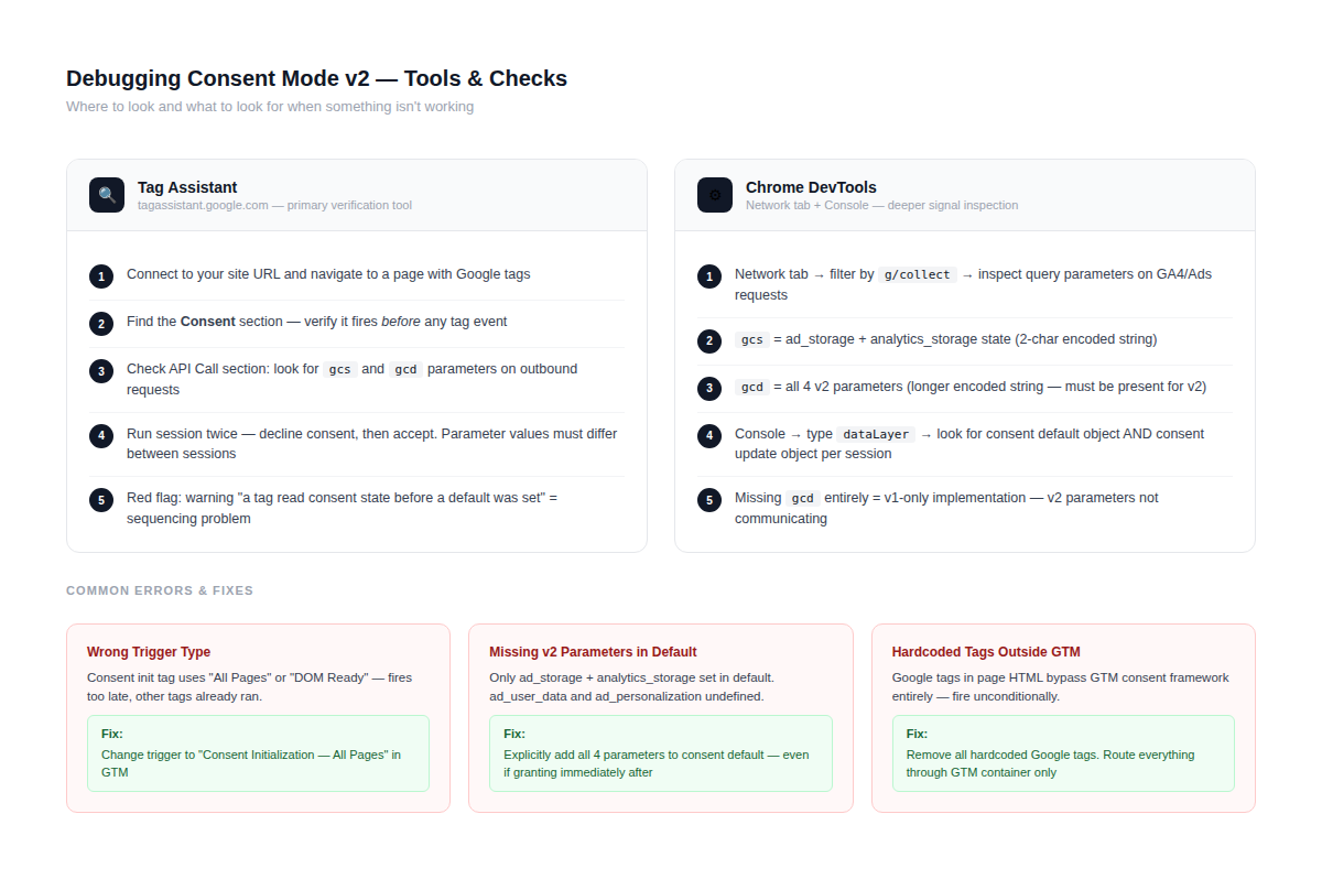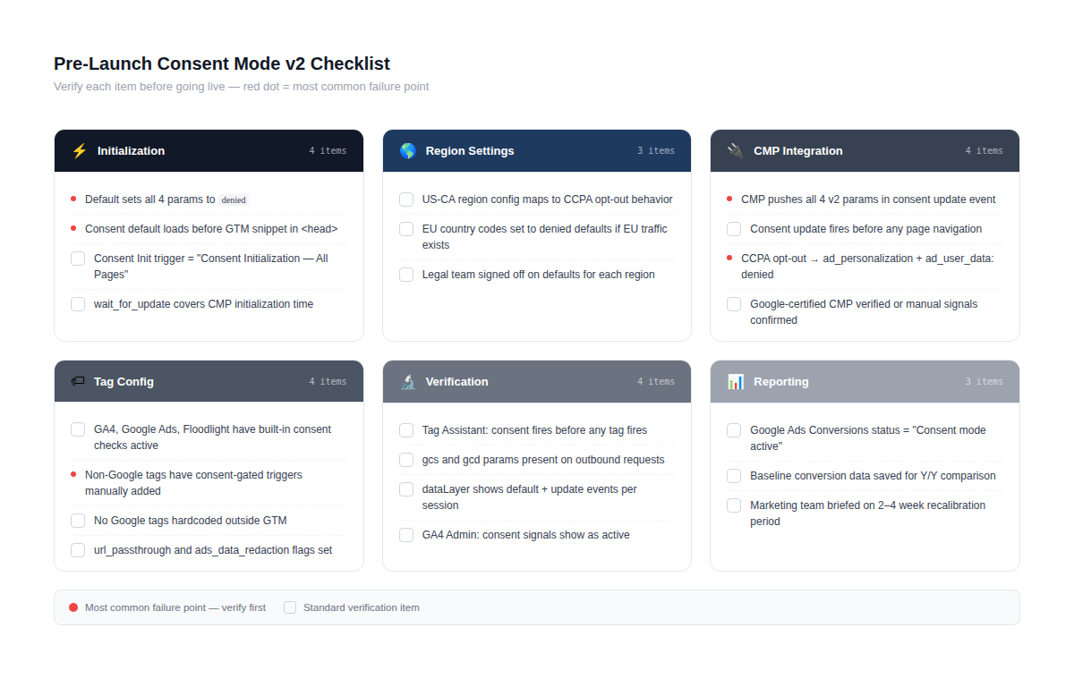 The most common mistake after launch is treating Consent Mode as a set-and-forget implementation. It isn't. Gunnar Griese, who documented one of the most detailed technical analyses of Consent Mode v2 behavior, makes this point directly: the complexity of the implementation means that changes elsewhere on the site — a CMS update, a new GTM tag, a CMP version upgrade — can quietly break consent signals without any obvious error appearing in your dashboards.