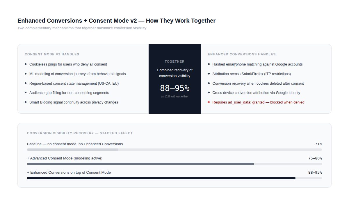 In practical reporting terms: advertisers who implement both Enhanced Conversions and Advanced Consent Mode see the best conversion visibility, combining two complementary recovery mechanisms. Dataslayer's analysis puts the combined uplift at 15–22% additional recovery on top of what modeling alone provides — Enhanced Conversions handles the cases where cookies were deleted or blocked after consent was granted, while Consent Mode modeling handles users who never consented.