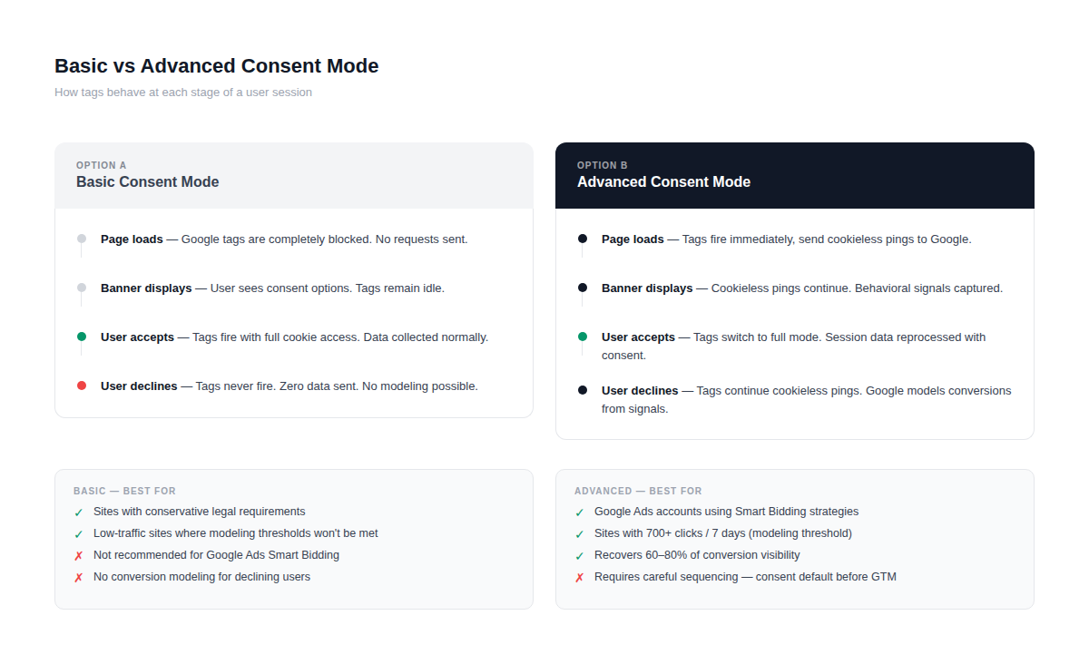 In Basic Consent Mode, Google tags are blocked from loading entirely until the user makes a consent choice. No data reaches Google while the banner is displayed. In Advanced Consent Mode, tags load immediately and begin sending cookieless pings — minimal requests without cookies or persistent identifiers — as soon as the page loads. Those pings feed Google's conversion modeling, which is what enables data recovery for non-consenting users. The practical difference: Advanced Mode gives you substantially better modeling accuracy and more complete conversion data, because Google has behavioral signals to model from even before consent is resolved. Basic Mode is simpler to implement and easier to explain to a conservative legal team, but you lose all modeling capability for users who decline. For most US Google Ads accounts where performance data quality matters, Advanced Consent Mode is the right choice.