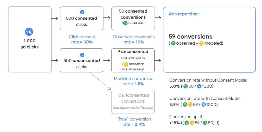 For your own account, the modeling math depends heavily on your consent rate and traffic volume. Advanced Consent Mode uses cookieless pings and behavioral modeling to estimate conversions, typically recovering 60–80% of conversion visibility compared to full consent. Below 20% consent rate, modeling accuracy suffers — which is why banner design and language matters. Neutral language like "We use cookies to improve your experience" performs better than aggressive "Accept all cookies now!" popups. Offering granular choices between analytics and advertising consent tends to increase acceptance rates.