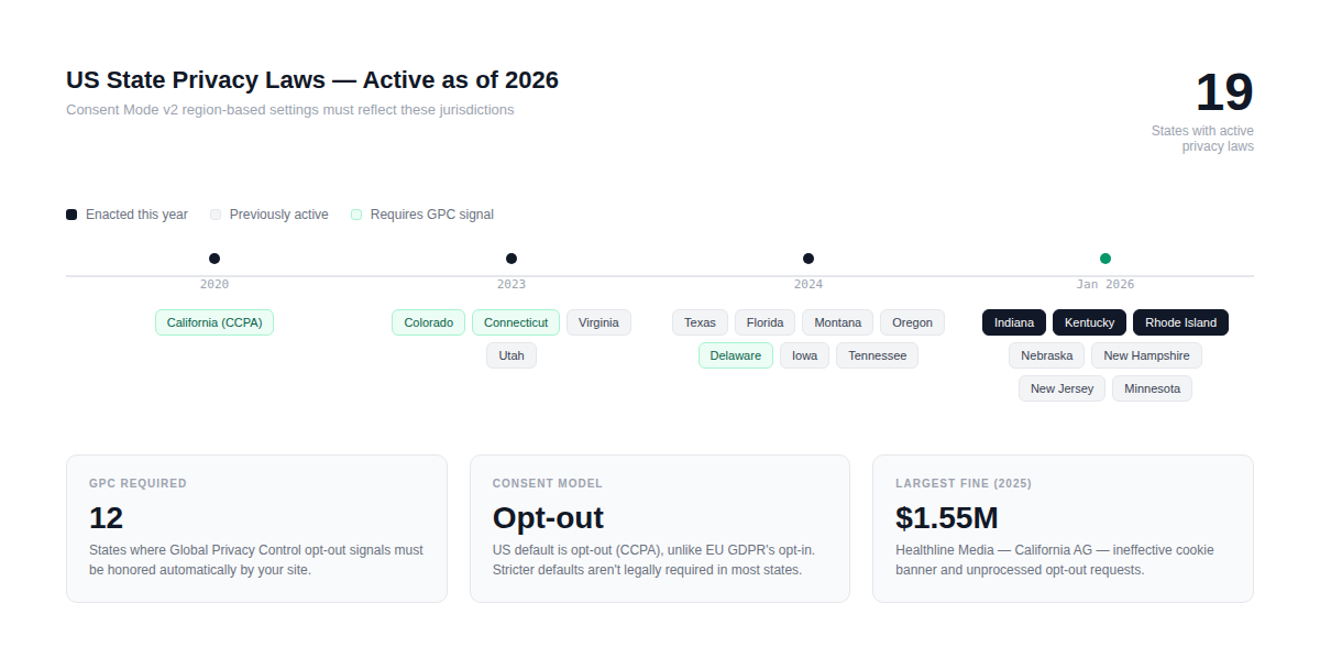 On the regulatory side, the landscape in 2026 looks different from even two years ago. Nineteen states now have active comprehensive privacy laws — Indiana, Kentucky, and Rhode Island joined that list on January 1, 2026. Twelve states require businesses to honor Global Privacy Control signals automatically. State attorneys general are no longer issuing warnings and waiting for correction: California's AG entered a $1.55 million settlement with Healthline Media in July 2025 specifically over an ineffective cookie banner and failure to honor opt-out requests. Tractor Supply Company paid $1.35 million for similar CCPA violations. California, Colorado, and Connecticut ran coordinated investigative sweeps in 2025 targeting companies that claimed to honor GPC while continuing to fire retargeting pixels in the background. The pattern in enforcement is consistent — regulators are looking at the gap between what your banner says and what your tags actually do. Google Consent Mode v2, correctly implemented, closes that gap.