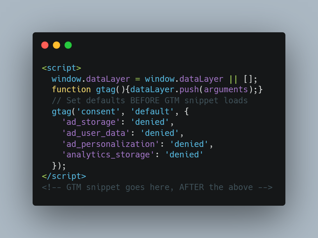 If you're not using GTM and are implementing Consent Mode directly through gtag.js — common in headless setups, SPAs, or when a developer has direct control over the HTML — the structure is the same, but you're managing everything in code rather than through the GTM interface.