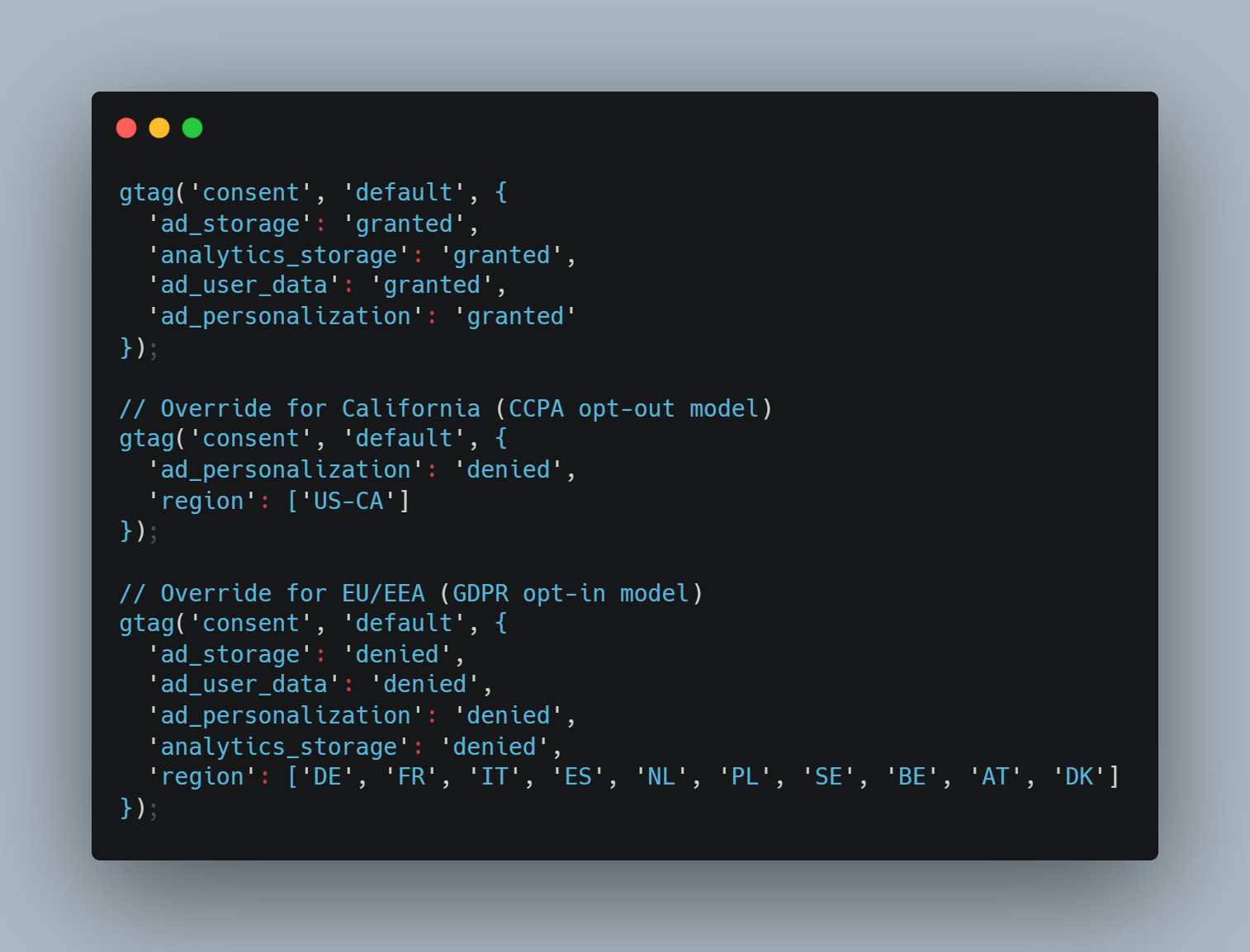 The first two existed in v1. The last two are new in v2 and give marketers more granular control over how user data flows into Google's advertising systems. In practice, this means you can now separately tell Google: "yes, track analytics" but "no, don't use that data to personalize ads" — which matters as US states keep adding new opt-out requirements around targeted advertising.