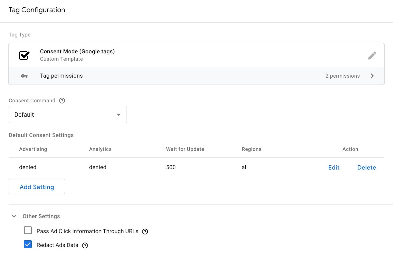 Two additional flags worth enabling alongside your gtag defaults, especially for Google Ads accounts. First, url_passthrough: true — this appends click identifiers to URLs when ad_storage is denied, allowing conversion attribution to work across page navigations without cookies. Second, ads_data_redaction: true — this strips ad click identifiers from requests when ad_storage is denied, giving you an extra layer of privacy protection on top of the consent signals. Both are recommended defaults for US advertisers running Google Ads, regardless of consent rate, as they ensure attribution continuity without compromising the consent signal integrity.