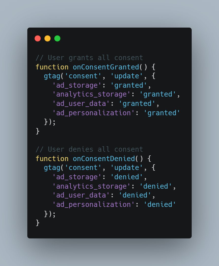 The default setup shown above is the starting point. The update call, fired when a user interacts with the consent banner, looks like this: