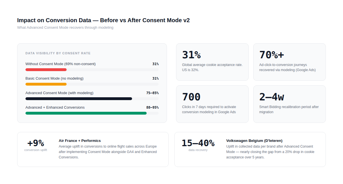 On the performance side, the business case is straightforward. Without Consent Mode, you're flying blind on somewhere between 30% and 70% of your traffic depending on your consent rate. With Advanced Consent Mode and Enhanced Conversions working together, most advertisers recover the majority of that visibility through modeling — not perfectly, but well enough to keep Smart Bidding strategies calibrated and audience lists functional. Air France's 9% conversion uplift and Volkswagen Belgium's 15–40% data recovery aren't outliers — they're what properly implemented consent infrastructure actually delivers.
