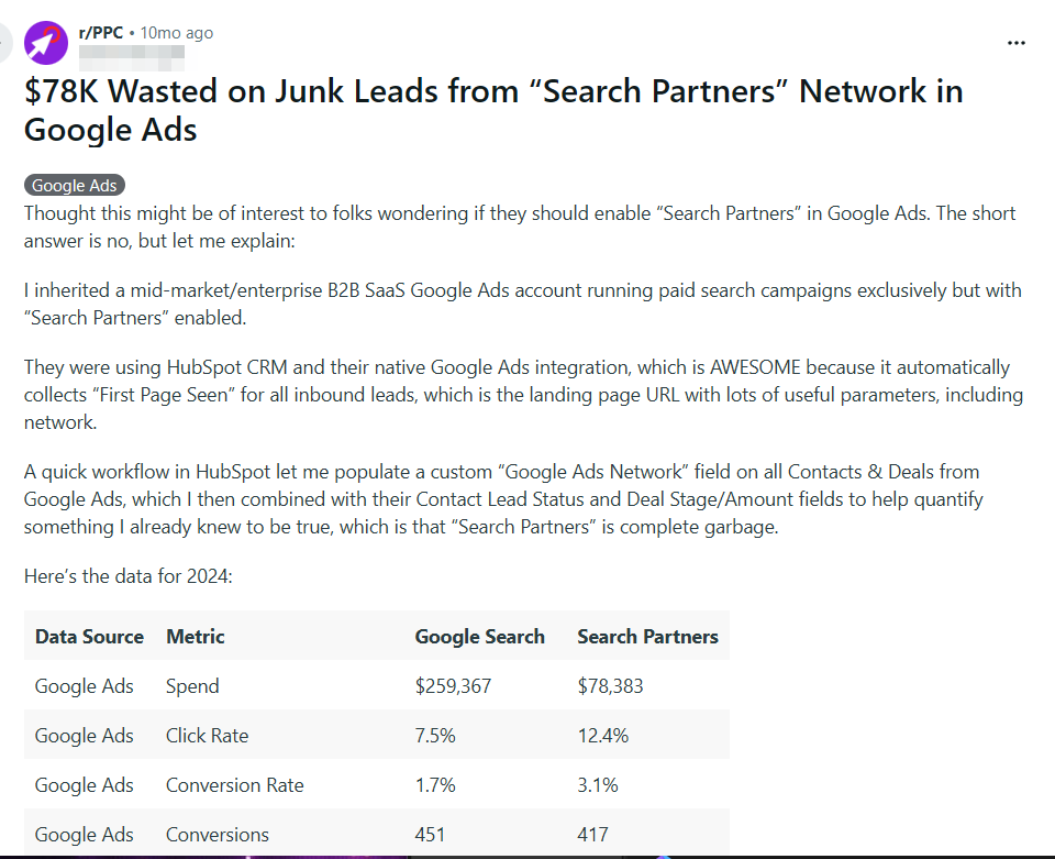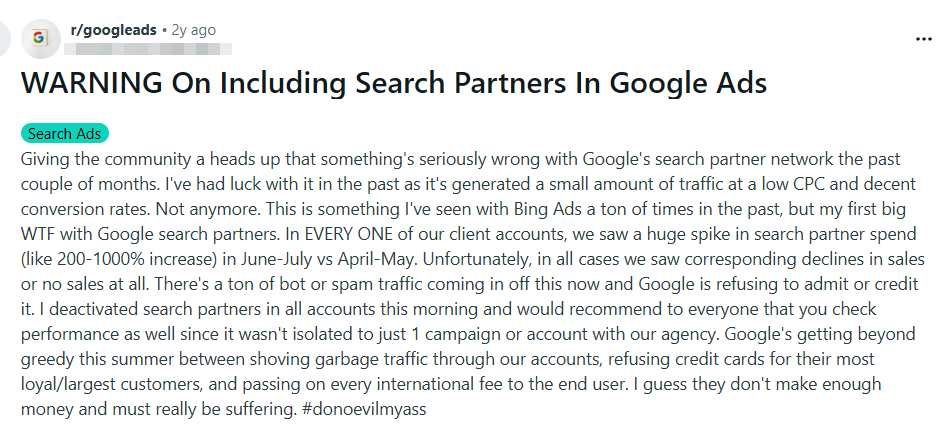 One Reddit user reported that when he enabled Search Partners, his campaign spend increased by 200–1000% – with zero sales. Google refused to issue a refund.