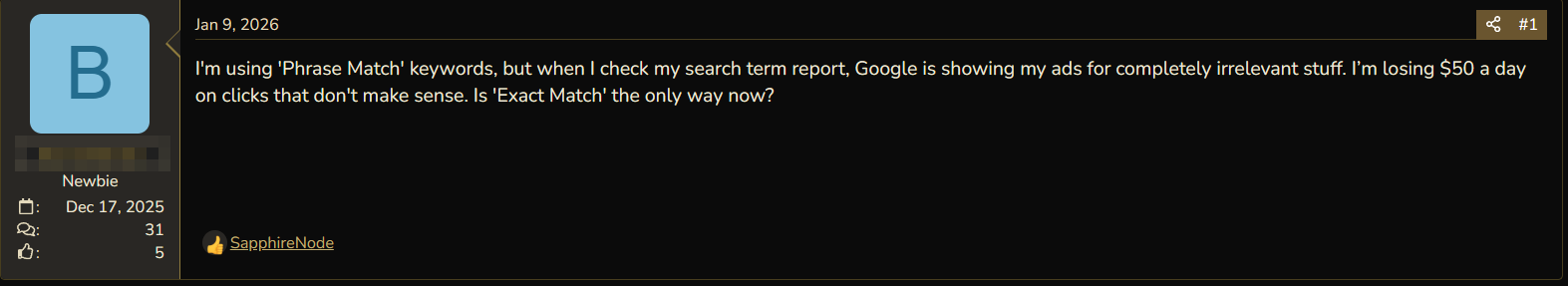 A similar issue was shared by an affiliate on BlackHatWorld: while using Phrase Match, he had to spend $50 a day on clicks for queries that had nothing to do with his offer.