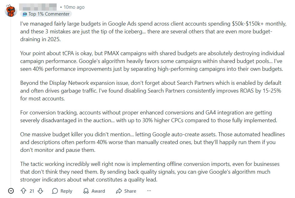 The solution is simple: disable Search Partners in your campaign settings. Reddit users report that this single action can increase ROAS by 15–25%.