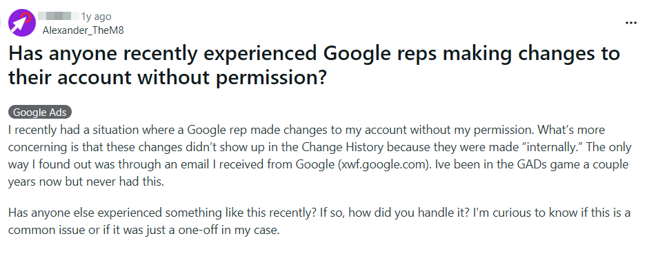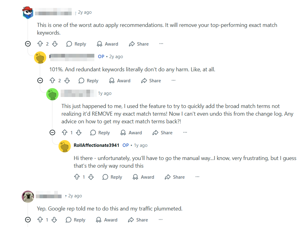 One Reddit user wrote plainly: "Google rep told me to do this and my traffic plummeted." Another found they couldn't revert the changes via the Change Log and had to restore the keywords manually.