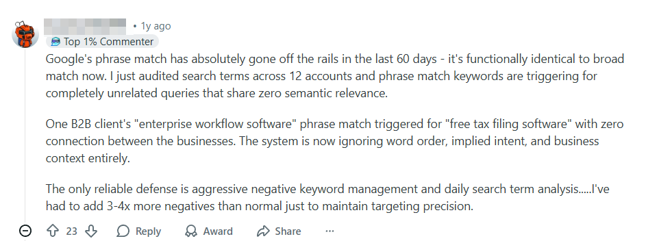 According to Reddit users, sometimes their commercial offer appears for completely unrelated commercial queries. One user shared that his phrase match keyword "enterprise workflow software" triggered an ad for the query "free tax filing software". There was zero semantic connection, yet Google decided the intent "matched".