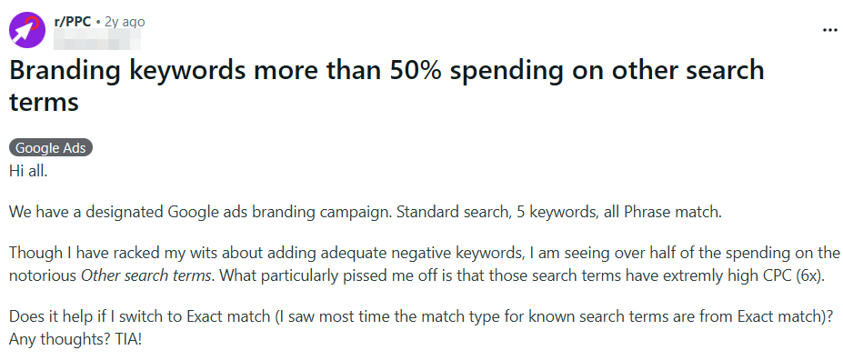 A Reddit user shared a situation: a simple brand campaign with only 5 keywords in phrase match, yet more than half the budget went into "Other". Clicks on hidden queries cost 6 times more than visible ones.
