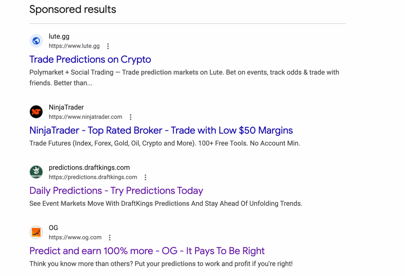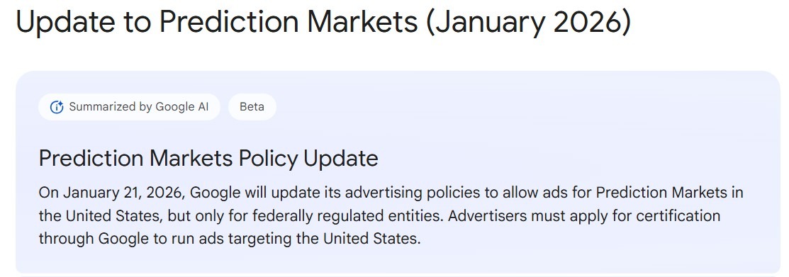 Starting January 21, 2026, Google officially permits ads for prediction markets. Google defines these as platforms that facilitate the listing of or provide customer access to Exchange-Listed Event Contracts related to economics, sports, or current events.