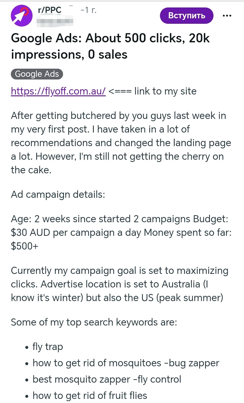 In another case, an affiliate running e-commerce for two weeks received 500 clicks, 20,000 impressions, and zero sales. Neither carefully selected keywords, nor a daily spend of $500, nor multiple landing page edits helped him.