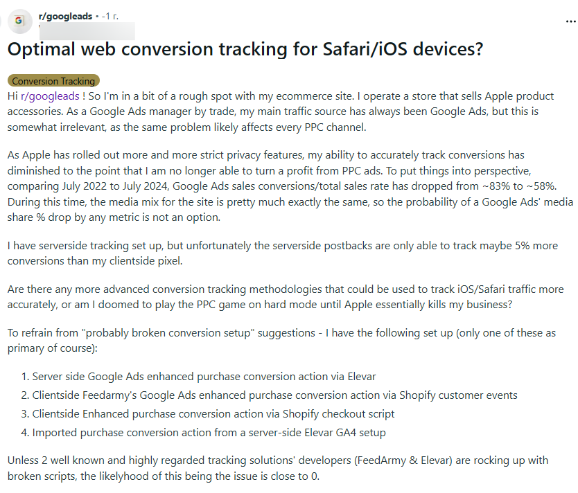 Many people face this. For example, the owner of an Apple accessories store recently shared his pain: over 2 years (from July 2022 to July 2024), the share of tracked conversions in Google Ads dropped from 83% to 58%—even with server-side tracking configured. iOS and Safari privacy updates are cutting attribution at the root.