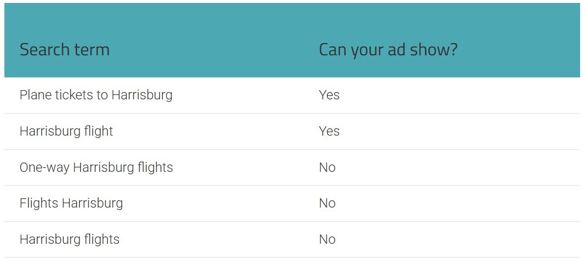 A cheat sheet on negative match types illustrates this with a clear example: a negative phrase match for "Harrisburg flights" blocks "cheap Harrisburg flights" and "book Harrisburg flights today" — but not "flights Harrisburg" because the word order changed. That distinction matters more than most advertisers realize. Phrase match negative keywords usage makes sense when you need to block a specific combination of words in a defined order, but don't need to catch every possible arrangement.