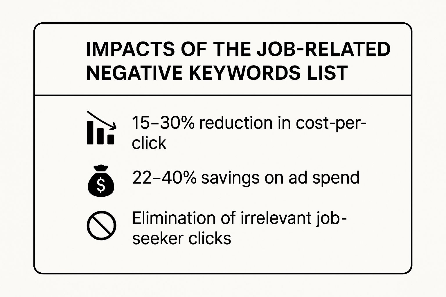 Negative keywords to block job seekers are among the most universally needed exclusions. A real example: two IT services companies were showing ads for "managed IT jobs" — paying for clicks from people looking for employment, not services. The fix is straightforward, but it requires thinking beyond just "jobs" as a single term.