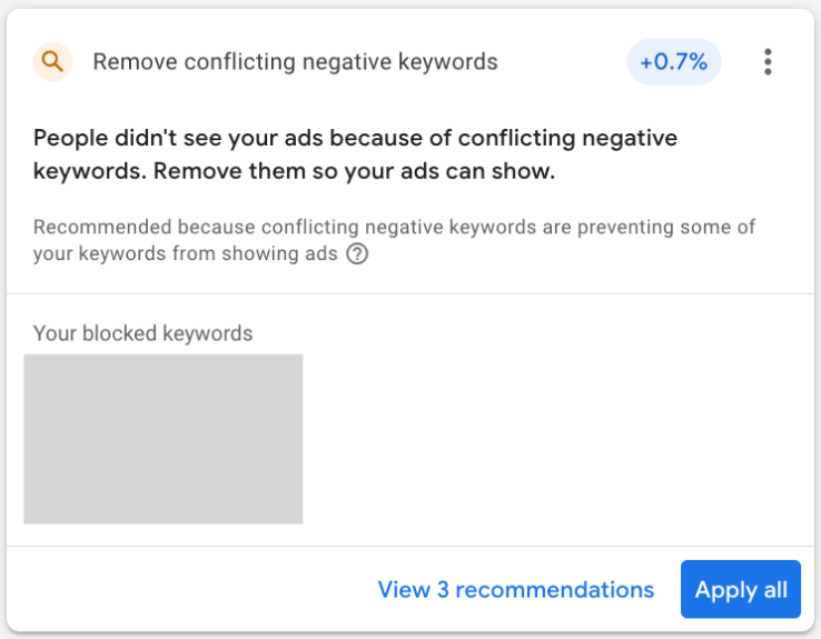 The warning signs that negatives have gone too far: impression share dropping without a corresponding bid change, Search Term insights showing fewer useful query categories over time, or Smart Bidding entering a prolonged learning phase after a large batch of negatives was added. We recommend using Google's "Remove conflicting negative keywords" recommendations to catch overlaps, and checking change history to trace any performance dips back to specific negative keyword additions.