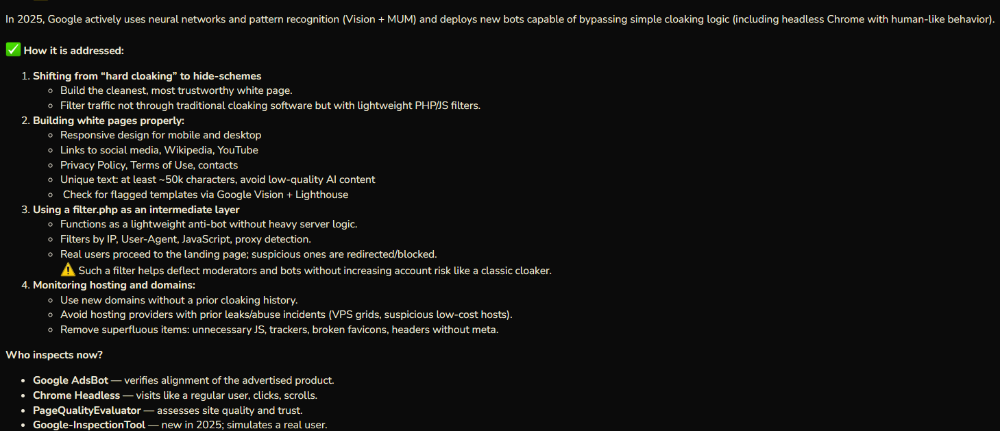 When an affiliate works with PPC traffic, two main elements are available to them: the landing page and the creative. Google uses responsive search ad mechanisms, so the creative is assembled for each user in real-time. Therefore, simple white pages, pre-landers, and generated pages are quite suitable for cloaking. Media buyers confirm this – one user used a white page for social casinos in their cloak, and the campaign ran successfully.