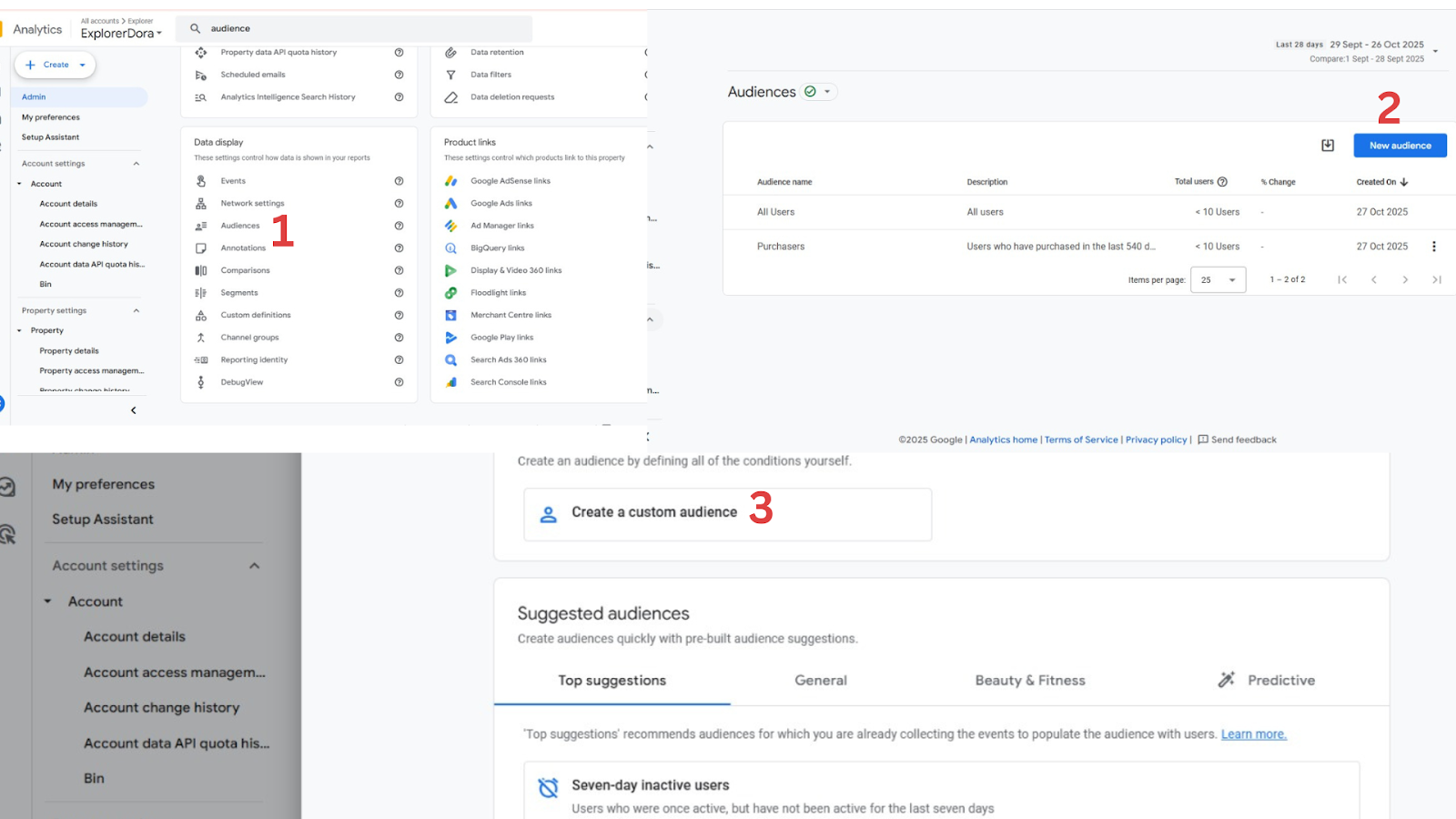 Caption: Screenshots tutorial showing a step-by-step guide for building and publishing audience in GA4.