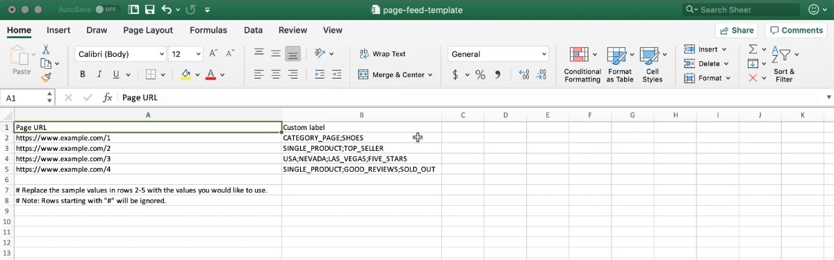 The spreadsheet is to be prepared in CSV format and should contain a column for Page URL and another for Custom Labels. Under the first column, you will list the full web address for various pages in your site, and the second column will be for decisions that Google will take regarding the listed URLs (e.g. include, exclude, or sections on the page to focus on). For more controls, optional columns like Page Title and Priority can also be included (we’ll discuss more on these soon).