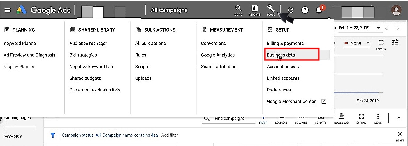 In Google Ads, go to ‘Tools & Settings’, click on ‘Setup’ and then ‘Business data’.