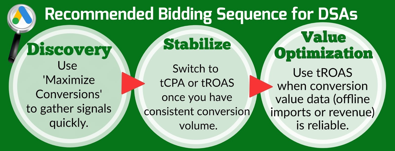 Practice phase budgeting by starting your DSAs at a conservative share of search spend (10–20%) during discovery. After 30–60 days, reallocate the budget to labels or targets that meet CPA/ROAS thresholds. Scale incrementally (10–20% increases) rather than doubling budgets. Then, your bidding strategy should be sequential, starting with Maximise Conversions at the point of discovery then switching to ‘Target CPA’ and ‘Target ROAS’ later when you have a stable yield, and when optimising your DSA campaigns.
